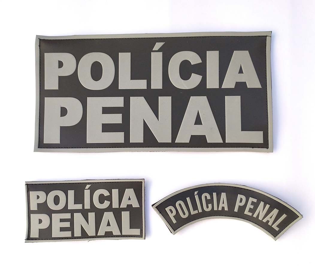 Kit tarjetas emborrachadas POLÍCIA PENAL, contém, 1 tarjeta para costas de colete medindo 20 cm x 10 cm, 1 tarjeta para o peito ou bornal medindo 10 cm x 5 cm e 1 tarjeta curva medindo 12 cm x 3 cm. Todas as tarjetas vão com fecho de contato.